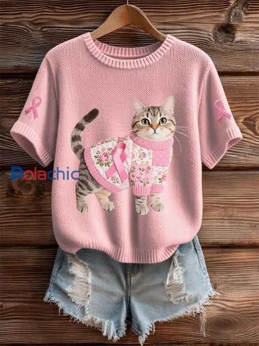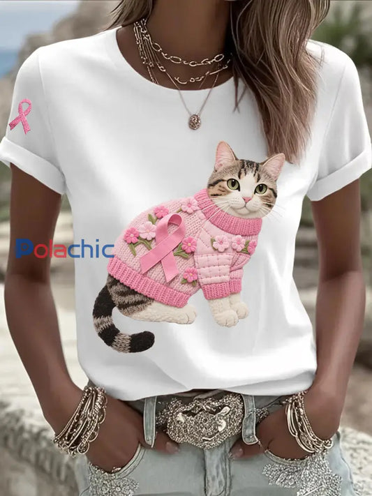 Femmes du cancer du sein chat imprimé mode Vintage lâche T-shirt à manches courtes