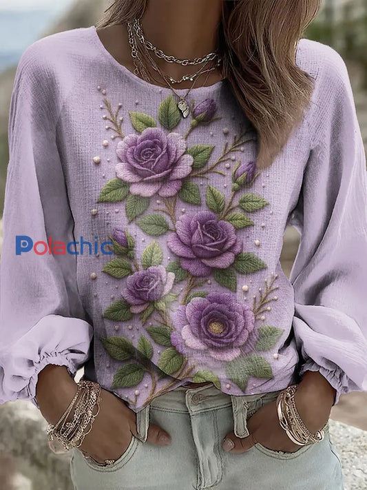 Retro 3D Floral Broderie Gradient Motif col rond T-shirt à manches longues pour femmes