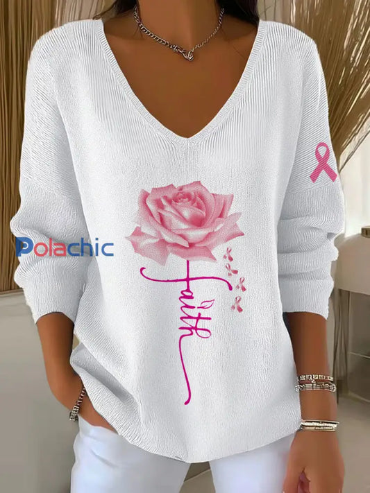 Haut Décontracté Femme Rose Ruban Imprimé Sensibilisation Au Cancer Du Sein