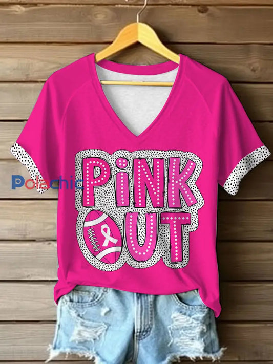 T-shirt à col en V rose pour femmes avec soutien et sensibilisation au cancer du sein