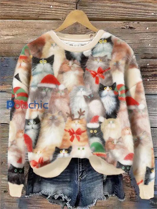 Mignon Noël Chat Art Imprimer Flanelle Casual Sweatshirt