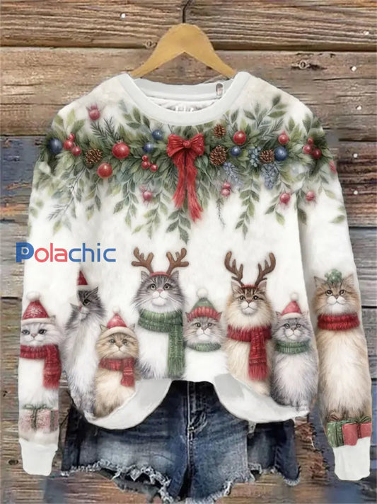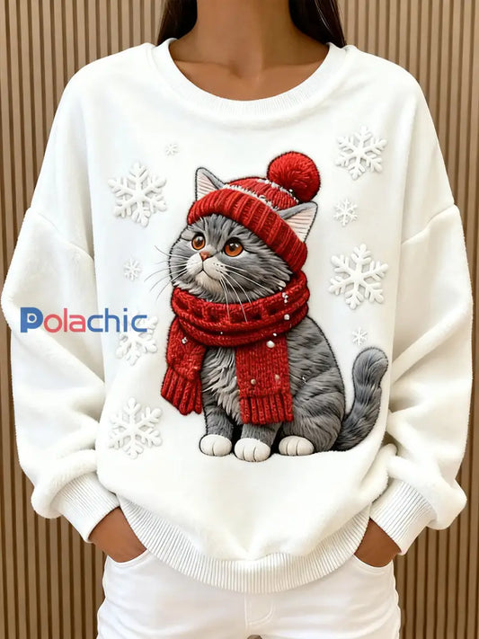 Pull en flanelle décontracté à imprimé d'art chat de Noël pour femmes