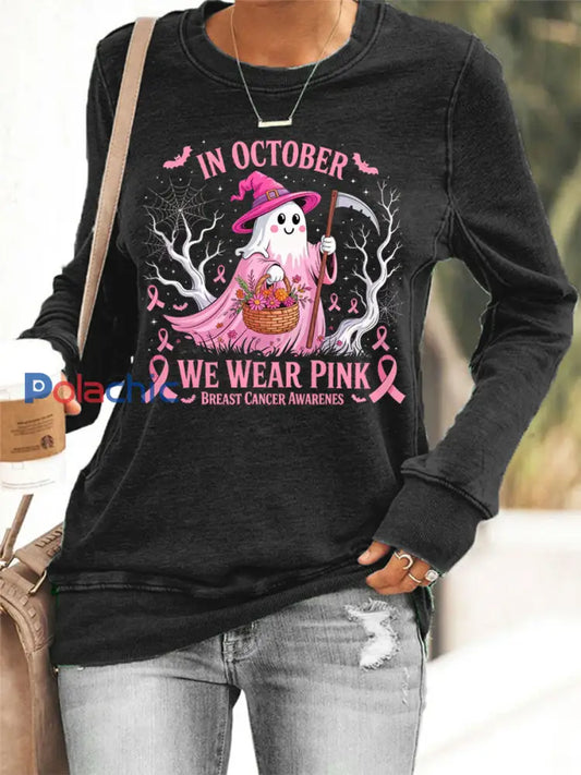 Femmes En Octobre Nous Portons Rose Halloween Rose Ghost Sensibilisation au Cancer du Sein Sweatshirt