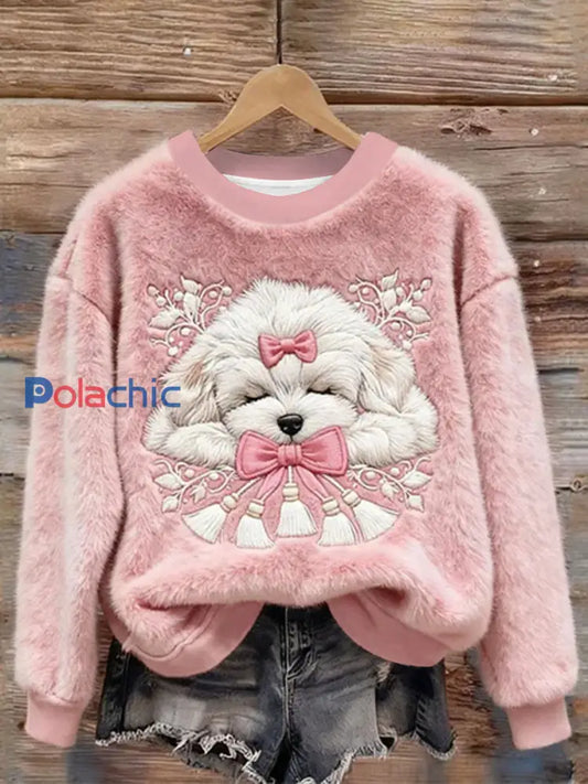 Chien de sommeil de Noël brodé confortable en peluche Sweatshirt des femmes