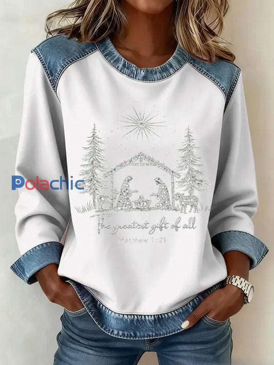 Femmes Mignon Chat De Noël Denim Patchwork Haut