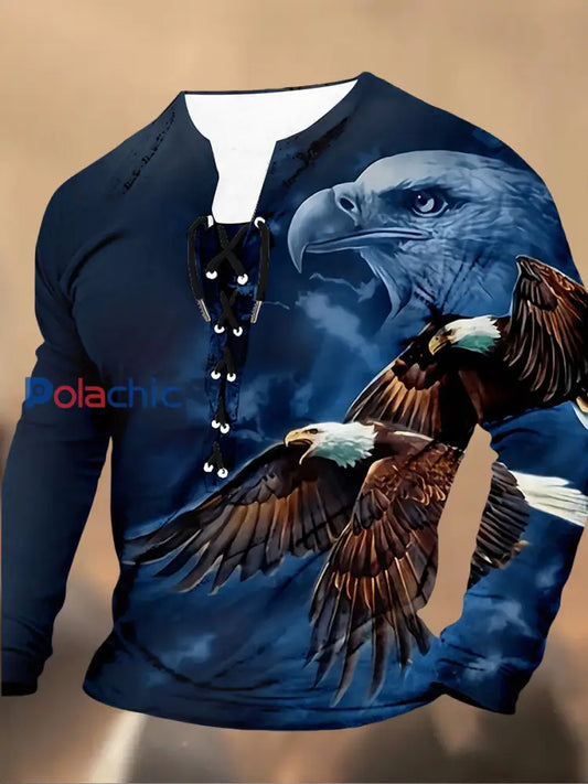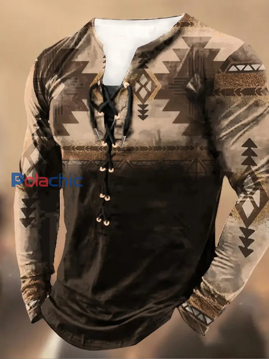 Vintage Western Art Print Country Style col en V Henley chemise à manches longues