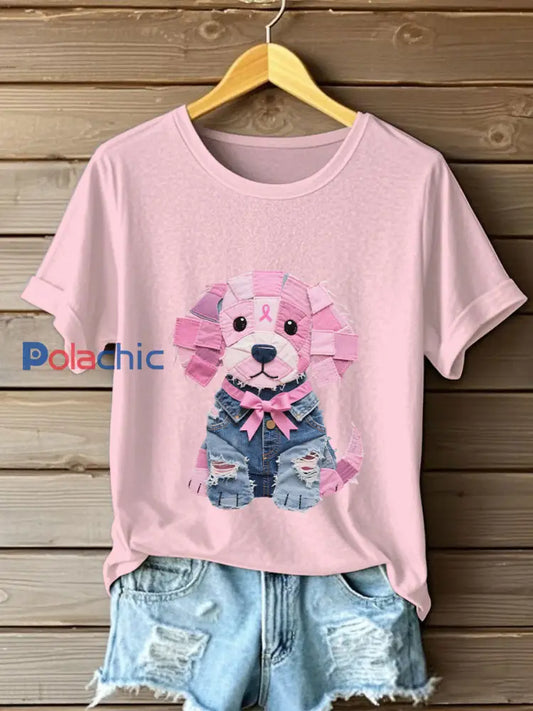 Femmes Cancer du sein Sensibilisation Denim Puppy Imprimer T-Shirt