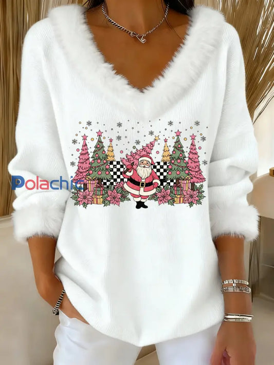 Haut décontracté à col en fourrure imprimé arbre de Noël pour femmes
